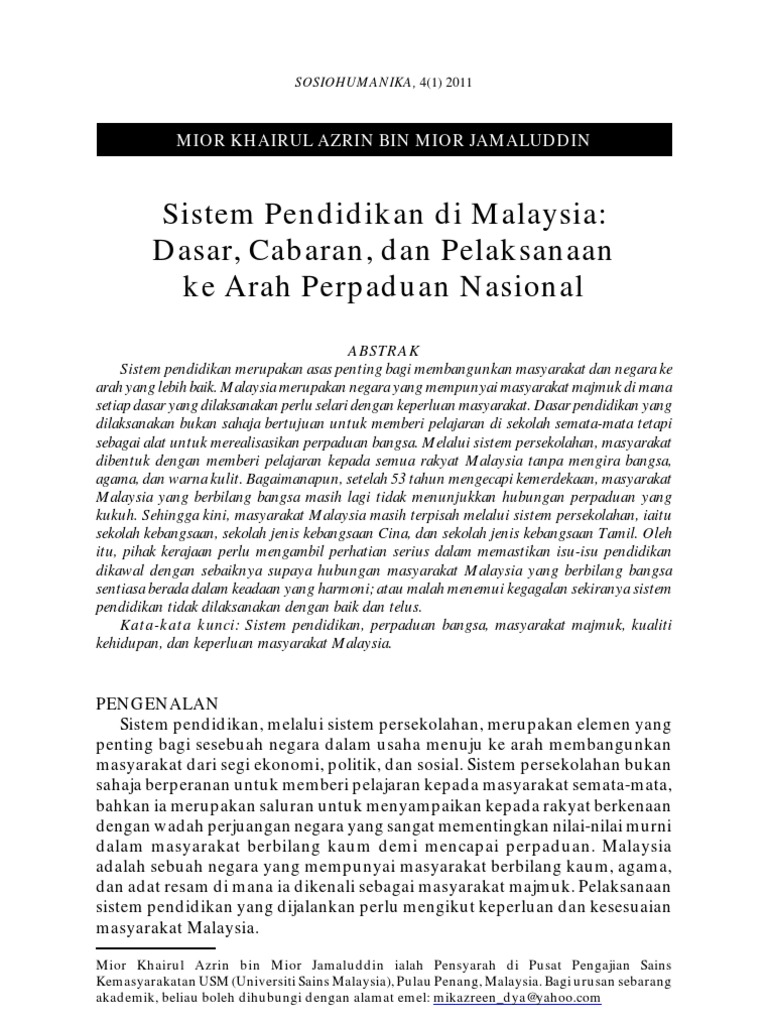 Pendidikan di Malaysia Ed. SOSIOHUMANIKA 4 1 2011 MIOR KHAIRUL AZRIN BIN MIOR JAMALUDDIN Sistem Pendidikan di Malaysia. Malaysia merupakan negara yang mempunyai masyarakat majmuk di mana setiap dasar yang dilaksanakan perlu selari dengan keperluan.